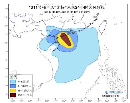 受“尤特”和西南季风的共同影响,14日14时至15日14时,南海北部、琼州海峡、北部湾、广东西南部及广东沿海、海南北部和东部及其沿海、广西东南部及其沿海将有7~9级大风,部分海域或地区风力可达10~12级,“尤特”中心经过的附近海面或地区风力有13~14级,阵风可达15~16级,另外南海中部和南部也将有6~8级大风。广东中南部、海南东部、广西东部、福建东南部、台湾南部等地有暴雨,其中,广东西南部、海南东北部、广西东南部等地的部分地区有大暴雨,局部有特大暴雨。
