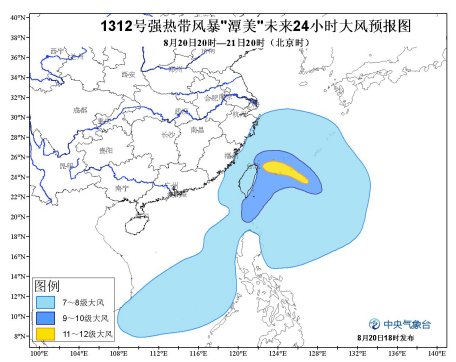 受“谭美”和西南季风的共同影响,20日20时到21日20时,东海南部海面、台湾以东洋面、巴士海峡、台湾海峡、台湾沿海、福建沿海、浙江沿海的风力将逐渐增大到8-10级,阵风11-12级,“潭美”中心经过的附近海域和地区风力可达11-12级,阵风13-14级,东海北部也将有7-8级大风,阵风9-10级,南海东北部、中东部和南部也将有6-8级大风;广东东南部、福建东北部、浙江东南部、台湾等地的部分地区有暴雨,福建东北部沿海及台湾大部有大暴雨(100~150毫米),台湾北部局部有特大暴雨。