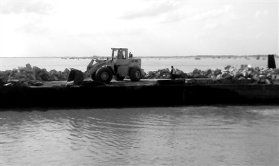 水务局接到水文部门的检测报道后,请专家对这里的大坑进行了研讨,最后确定用大块石料进行填充。刘晗告诉记者,他们从宾县紧急调运了2个驳船的石料,一共800立方米。20日中午在大顶子杭电枢纽装船完毕,连夜发往哈尔滨,于21日下午抵达了苏家屯段。为防止被水流冲走,运来的石料大块的多,只能动用铲车,把石料投放到河床的大坑处。预计22日上午,石料投放完毕。