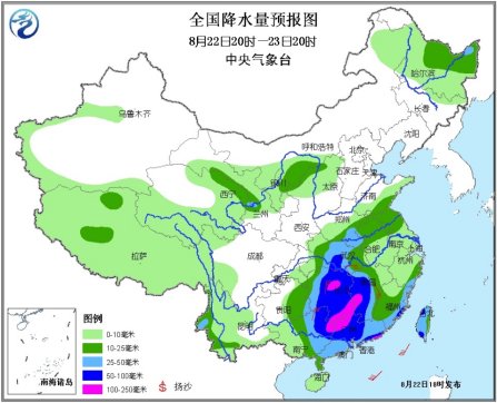 受“潭美”和西南季风的共同影响,22日20时到23日20时,福建东部、台湾大部、江西中西部、湖南大部、广东大部、广西中东部、湖北中部、河南东南部等地有大雨或暴雨,其中,广东西北部和东南部沿海、江西西南部、湖南南部和中部等地的部分地区有大暴雨,局部特大暴雨(250~300毫米)。