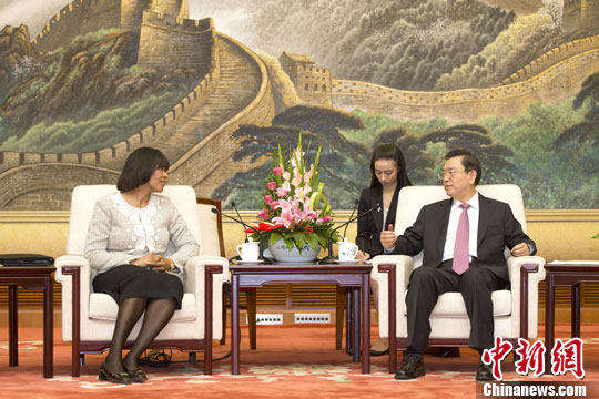 8月22日,中国全国人大常委会委员长张德江在北京人民大会堂会见牙买加总理波西娅·辛普森-米勒。中新社发 盛佳鹏 摄