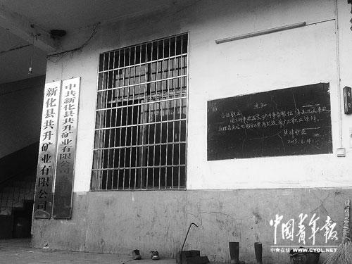8月31日,已被关闭的共升煤矿内部。该矿办公楼一层的黑板写道,由于处理“7·24事故”事务较繁忙,七月份工资需过几天再发放。本报记者 卢义杰摄
