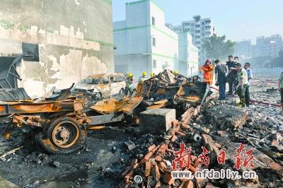 工地和仓库间的砖墙以及外围围墙均被炸穿,发生爆炸的货车已经完全看不出原来的模样,只剩下光秃秃的铁架,车头基本上被削平,旁边的两辆面包车也只剩下了一个车架。
