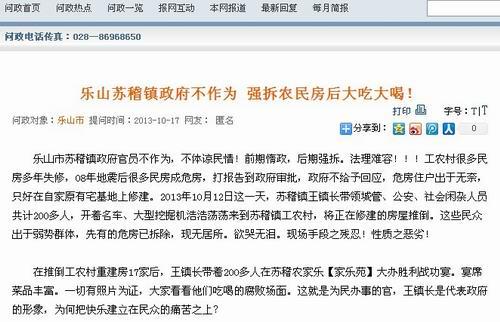 “乐山市市中区苏稽镇政府强拆工农村17户农民房屋后,200余人在农家乐大摆宴席!”10月17日,有网友在四川日报网《问政四川》栏目反映。对此,苏稽镇政府给四川日报网发函回复称,拆除的房屋均属违章建筑;乐山市市中区纪委表示,网友所说的“公款大吃大喝”现象并不存在。