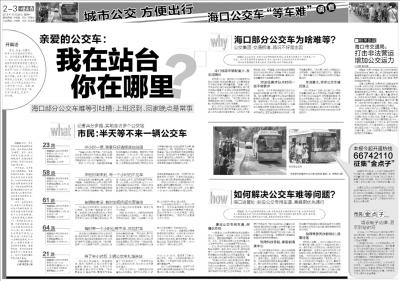 昨日,本报“海口公交车‘等车难’调查”专题报道引起椰城市民的广泛共鸣。“我看了海南特区报关于等车难的专题报道,真是反映了我们广大老百姓的心声。”市民孙先生致电本报热线称,“作为普通的工薪阶层,几乎每天都要等公交,很多时间都浪费在等车上。”