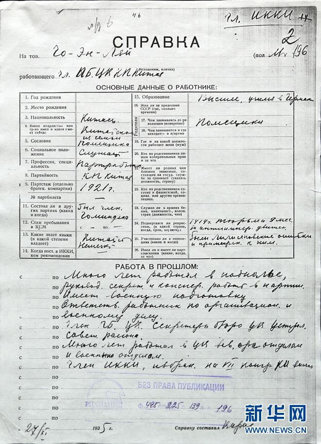 1921年春天,经张申府、刘清扬介绍,周恩来加入中国共产党八个发起组之一的巴黎共产主义小组,从事党的创建活动。图为周恩来为共产国际填写的履历表,其中注明:1921年加入中国共产党。