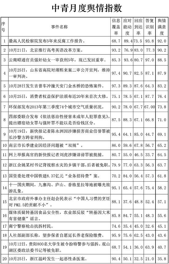 它的信息覆盖率,与第5名的“消费者权益保护法近20年来首次大修”,第7名的“环保部发布2013年第三季度74个城市空气质量状况”,第14名的“十一黄金周旅游乱象”等同列高位,超过90%。