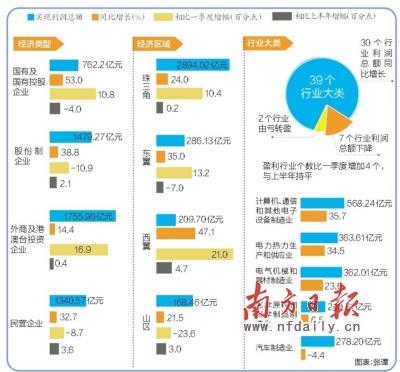 分经济类型看,国有及国有控股企业实现利润总额762.2亿元,同比增长53.0%,增幅比一季度提高10.8个百分点,但比上半年回落4.0个百分点;股份制企业实现利润总额1479.27亿元,增长38.8%,增幅比一季度回落10.9个百分点,比上半年提高2.1个百分点;外商及港澳台投资企业实现利润总额1755.90亿元,增长14.4%,增幅分别比一季度和上半年提高16.9个和0.4个百分点;民营企业实现利润总额1340.57亿元,增长32.7%,增幅比一季度回落8.7个百分点,比上半年提高3.6个百分点。