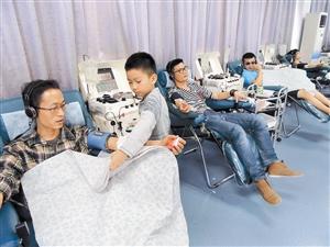 上周末,不少市民到分布于全市的捐血车或捐血站献血奉献爱心,献血人数较平时多三分之一。图为一个小孩陪父亲到市捐血站献血。 深圳特区报记者 张耀波 通讯员 黄天肇 摄