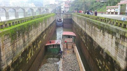 昨日下午4点30分左右,华西城市读本记者再次来到了自贡市沿滩区邓关镇的济运闸,看到船闸内水位已明显下降,而沉船前部已露出水面,只剩下后半部分仍泡在水里,在沉船里面的工作人员正将装载的鹅卵石转移到一旁的运输船上。“今天中午11点左右,我们堵好闸门后就开始用四台抽水泵和一艘抽沙船不停抽水,目前一切都按计划进行。”据现场一位自贡市釜溪河堰闸管理处工作人员说,目前要减轻沉船上的重量,然后让其自己浮起来。“还要继续抽水,保持水位稳定,如果不出意外,必须在今晚上(6号)熬夜将沉船弄出船闸,保障运输通畅。”该上述工作人员说。