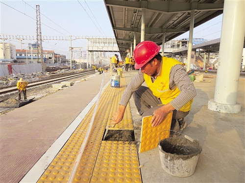 昨日下午4时许,记者来到柳州火车站高铁改造工程施工现场看到,新建的4号、5号站台已拔地而起,有的工人在做涂漆,有的在做贴瓷砖等收尾工作。高铁站台前的轨道已铺设完成,许多施工人员正集中力量进行站台两端道岔区的轨道铺设。