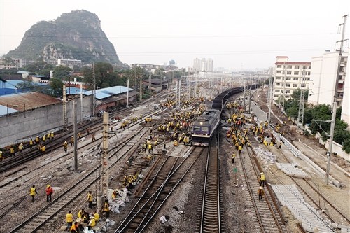 为配合柳州火车站拨接施工,从18日凌晨2时40分至早上8时10分,南宁铁路部门对途经柳州火车站的所有列车实行封锁暂停行驶,18日部分从南宁等方向途经柳州客车停运。为在短时间内按时按质完成拨接任务,中铁二十五局六公司调来2000多名铁路工人奋战,电气化部门也调来1000多人做信号拨接工作。