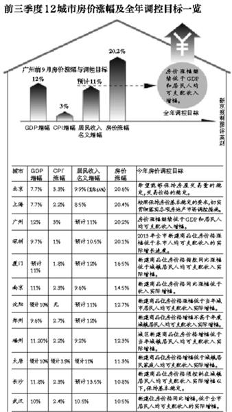 以广州为例,今年初该市制定的房价控制目标是,至少不应高于GDP的涨幅和城市居民人均可支配收入的涨幅。今年广州“两会”上,该市上述两项指标的预期分别是10%和11%。若按11%的目标计算,前9月,该市房价涨幅已超出预期目标8个百分点,要完成控制目标几无可能。