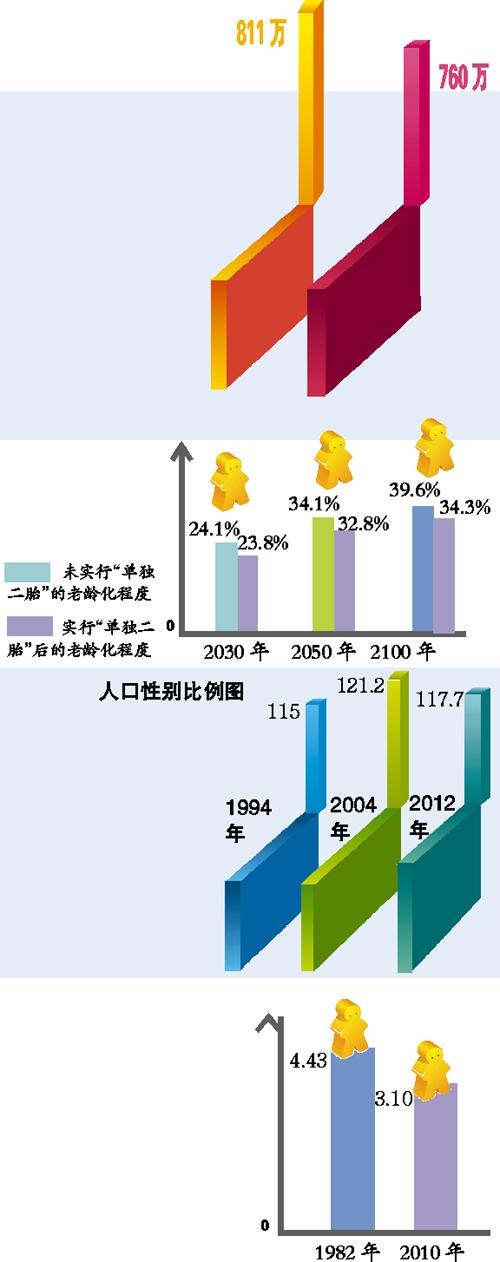 备注:南开大学人口与发展研究所教授原新说,实施“单独二胎”政策,到2030年将使老龄化水平从24.1%下降到23.8%,到2050年从34.1%下降到32.8%,到2100年从39.6%下降到34.3%。