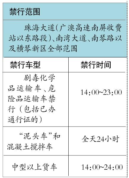 为确保国际马戏节期间道路交通安全畅通,马戏节期间(11月20日~12月1日)珠海交警将对剧毒化学品运输车、危险品运输车、自卸货车、混凝土搅拌车、中型以上货车等重点车辆实行交通管制(详见表格)。(记者 陈治家 通讯员 杨小江)