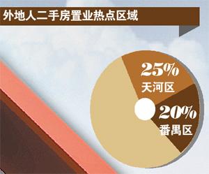 记者了解到,目前广州市内最受非广州户籍买家欢迎的二手房置业热点在天河区,近两个月内约有25%的非广州户籍买家选购了天河区的物业,而番禺区是另一个非广州户籍买家置业的热点,近两个月当中接近20%的非广州户籍买家选购了番禺区的二手房。