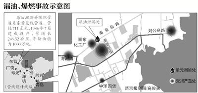 官方这样通报了当天的情况:22日凌晨3时,位于青岛经济技术开发区秦皇岛路与斋堂岛街交会处的中石化管道公司输油管线破裂,原油泄漏。上午10时30分左右,管道公司和黄岛油库在清理油污过程中,开发区海河路和斋堂岛街交会处发生爆燃,距此地约1公里外的雨水管道末端入海口处发生原油燃烧。