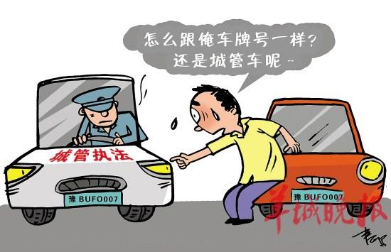 开封市民王先生的朋友梁先生日前在街上看见路边一辆车的车牌号竟和王的车牌号一模一样,更令人意外的是车身上还有“城管执法”字样。梁先生立马给王打了电话,然后一起在车边等候。此后过来两个人,自称是禹王台区城管局的,并要协商和解。“执法犯法!”围观群众纷纷替王先生打抱不平。(据《大河报》)