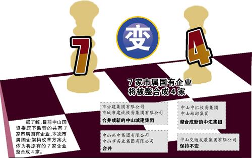 记者从中山市国资委获悉,市政府正对国资委旗下的7家市属国有企业进行新一轮的架构重组,原有7家市属国有企业将被整合成4家,市国资委有关负责人表示,此轮市属国企重组为了全面优化国企的内部资源,使之适应更激烈的市场竞争发展需要。