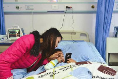 小伤员在妈妈的陪伴下接受治疗。
