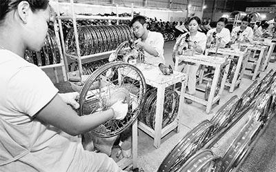 今年12月11日是中国加入世贸组织12周年。自加入世贸组织以来,中国更加主动积极地参与经济全球化。图为在越南兴安省,一些越南工人在中国重庆力帆—越南摩托车制造联营公司的轮毂生产线上工作。