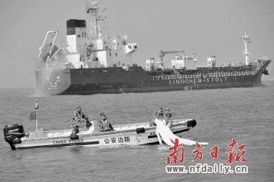 昨日上午,惠州市在大亚湾海域进行海上应急综合演习。图为演习海上“救火”。南方日报记者 梁维春 摄