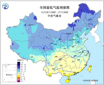 中新网12月26日电 中央气象台发布最新天气预报,预计26~27日,冷空气继续东移南下影响南方地区,江南、华南等地气温将下降4~6℃,中国东部和南部海区有7~8级风;云南东北部、贵州西北部地势较高的地区有雨夹雪或雪,局地冻雨。