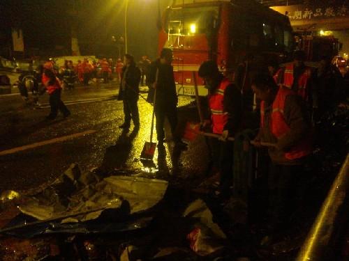 四川在线记者 周志敏 钟帆 27日凌晨6点10分报道 6时10分,数十名环卫工人和路灯管理局的工作人员拿着工具对事发现场外围进行清理。