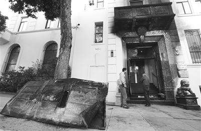 中新社记者2日上午再次到位于拉古那街1450号的总领馆门前,被汽油焚烧后黢黑变形的一扇铁门仍旧放在门前一棵大树旁,台阶上通往馆内的两扇门紧闭。