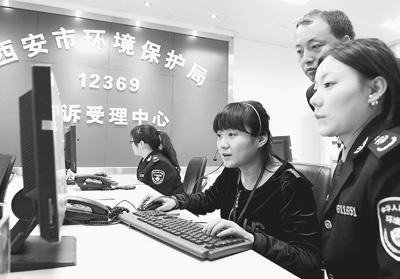 2013年10月24日,陕西省西安市环保局举行“12369环保热线开放日活动”,邀请市民代表接听投诉电话,了解投诉程序。