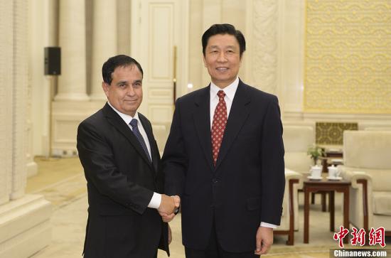 1月13日,中国国家副主席李源潮在北京人民大会堂会见了秘鲁国会主席弗雷迪·奥塔罗拉·佩尼亚兰达。中新社发 廖攀 摄