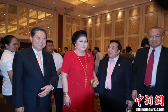 图为已年逾八旬的菲律宾前第一夫人伊梅尔达·马科斯一袭红妆,出席招待会。中新社发 张明 摄