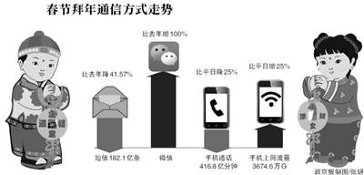 工信部昨天公布的数据显示,今年春节假期我国手机用户上网流量平均达46.6M,比平日流量高25.3%。而短信业务则出现明显下滑,除夕当日发送量同比下降8.0%。