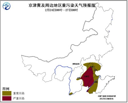 预计24至26日,京津冀大部、山东西部空气污染气象条件很差,重度污染天气将持续,其中,北京南部、天津西部、河北中南部、山东西北部的部分地区将达到严重污染。预计27日上述地区重污染天气将趋于结束。