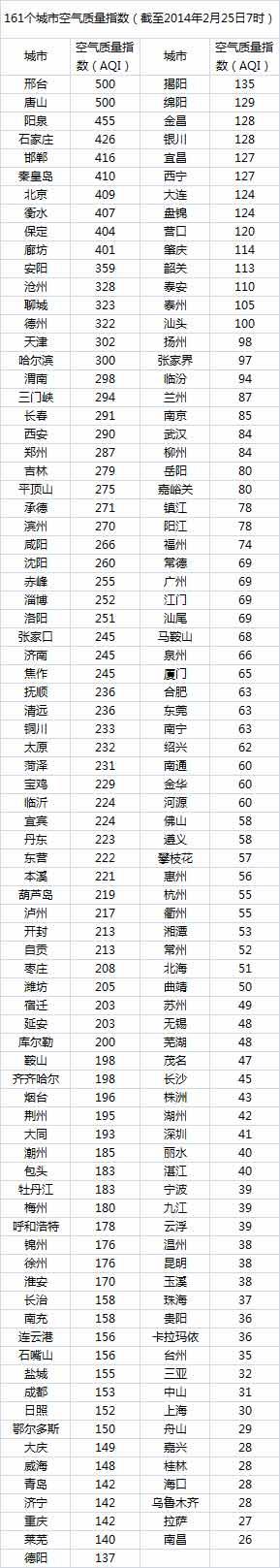 根据环保部公布的最新数据,截至今天早上7时,邢台、唐山的AQI(空气质量指数)达到500,指数"爆表",属于六级严重污染,成为161个参与空气质量排名的城市中空气质量最差的城市。今日空气质量最差的10个城市分别是邢台、唐山、阳泉、石家庄、邯郸、秦皇岛、北京、衡水、保定和廊坊,其中8城属于河北省。
