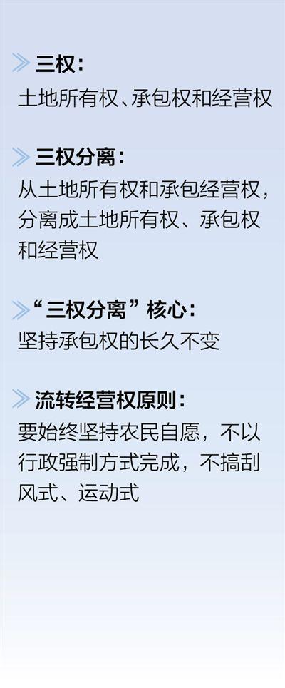 张桃林表示,三权指的是“所有权、承包权和经营权”,“集体所有、家庭承包、多元经营”是农地制度创新的基本方向,根本目的是保护农民利益,促进农业发展。“三权分离”的核心,是坚持承包权的长久不变。