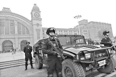昨日,武汉警方紧急部署,在重点区域增派特警24小时持枪执勤,极少露面的“猛士”越野车昨日起驻守三大火车站。