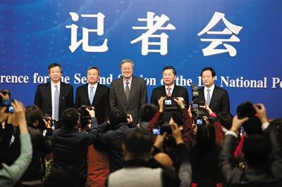 昨日,周小川(中)、尚福林(右二)、肖钢(左二)、项俊波(右一)、易纲(左一)出席记者会。
