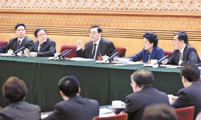▲3月11日,中共中央政治局常委、全国人大常委会委员长张德江参加十二届全国人大二次会议河北代表团审议。中共中央政治局委员、国务院副总理刘延东参加审议。省委书记、省人大常委会主任周本顺主持会议并发言,省委副书记、省长张庆伟在会上发言。