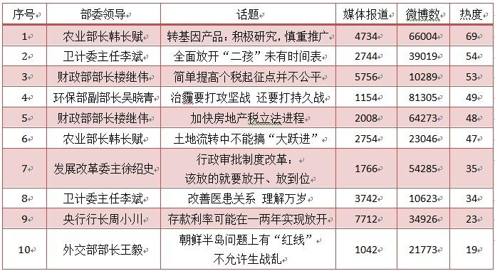 从媒体和网民的关注热度来看,在记者会的话题传播上,贴近民众生活的话题受关注度较高,转基因产品、治理雾霾以及医疗改革等话题都紧贴百姓生活。各部委领导或以身作则来进行说理,或以形象比喻来解答记者提问,使得部委记者会的传播面更广,影响力更大。从人民网舆情监测室监测平台上可以看出,在部委记者会上前十位话题网络传播总量超过3.3万篇,微博平台上相关讨论微博有37万条,呈现出较高舆论关注热度。