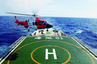 “海巡01”轮在南印度洋海域出动船载直升机对附近水域进行搜寻 图/新华社