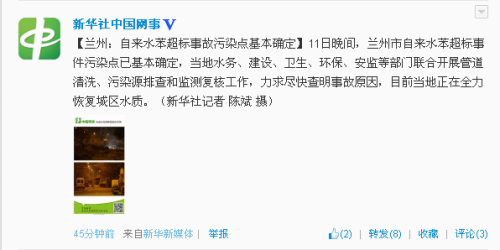 中新网4月12日电 据新华社“中国网事”官方微博消息,11日晚间,兰州市自来水苯超标事件污染点已基本确定,当地水务、建设、卫生、环保、安监等部门联合开展管道清洗、污染源排查和监测复核工作,力求尽快查明事故原因,目前当地正在全力恢复城区水质。
