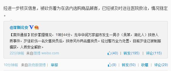 人民网北京4月23日电 据深圳公安官方微博消息,19时44分,龙华华润万家超市发生一男子(吴某,湖北人)挟持人质事件,歹徒砍伤一名女售货员后,挟持另外两名售货员。经过警方全力处置,目前歹徒已被制服擒获,人质安全解救。