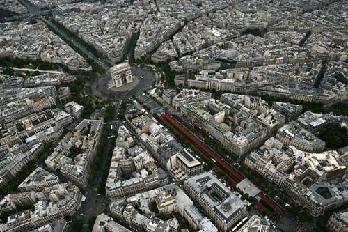 巴黎鸟瞰图,可以清晰地看到南北穿过大凯旋门的城市中轴线