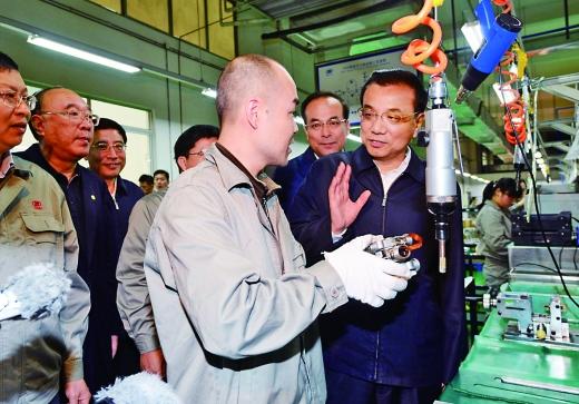 28日上午,李克强总理来到研发工业自动控制系统的重庆川仪公司考察。在仔细了解企业科技创新产品的研发、生产、销售情况后,他对企业研发人员和工人说:“创新是我国产业升级的必由之路和关键举措。中国经济升级,创新是旗帜,是脊梁!靠你们啦!”