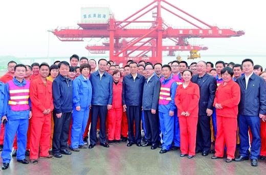 4月28日,李克强总理在果园港与建设工人合影。