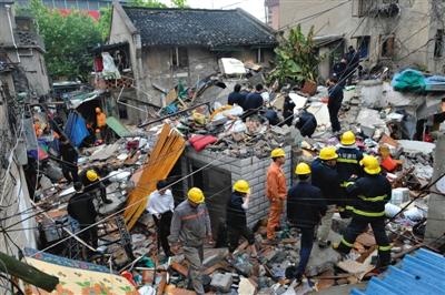 倒塌之处是一栋老式居民楼,砖木结构,三层建筑。爆炸发生后,三层居民楼完全倒塌,旁边的一层建筑也遭损毁。