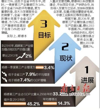 根据方案,到2016年,顺德第三产业增加值占地区生产总值比重,要比2013年提高2%,内部结构也将逐步优化,现代服务业增加值占服务业比重,要比2013年提高2%。(记者 张培发 实习生 高绮桦)