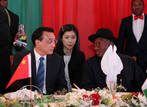 中新网阿布贾5月8日电(记者 郭金超) 当地时间7日晚,尼日利亚总统乔纳森夫妇在总统府为李克强总理和夫人程虹举行隆重欢迎宴会。现场尼方两次奏响中国国歌,感谢李克强在尼安全局势严峻时刻”冒险”访问,感谢中方对尼的巨大支持。