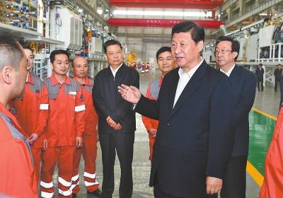 秉承“振兴民族工业、实现中国梦想”理念,中铁工程装备集团有限公司不断依靠技术创新,目前已经成为市场占有率国内第一、世界第二的世界三大掘进机生产商之一。10日上午10时50分,习近平走进公司总装车间,不时与现场科技人员和职工握手,道上一声声辛苦,车间职工大声向总书记问好,兴奋地围拢簇拥到总书记身边合影留念。车间内“惟创新者强,惟创新者胜”的标语格外醒目。习近平详细了解隧道掘进机研发制造和企业自主创新情况,听说一人就能操控80~100米长的“庞然大物”——隧道掘进机,总书记兴致勃勃地登上一座85米长的盾构机装配平台控制室察看。习近平说,盾构技术是工程上的“穿山甲”,有了这个技术,很多难题就可以解决,工程的效率、安全得到了巨大提升和保障。你们有很多领先技术,无论是自主创新,还是走出去、请进来,引进消化吸收再创新,都做得不错。祝你们不断取得新成绩、作出新贡献!
